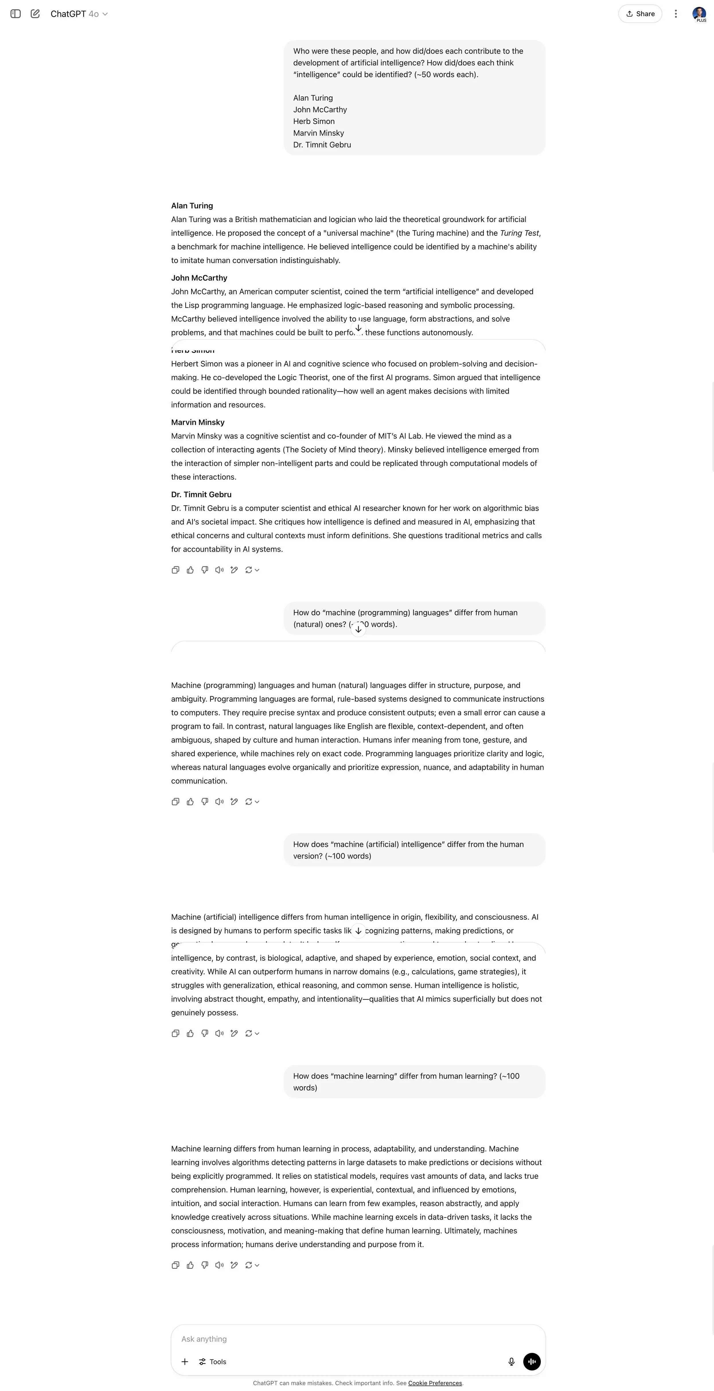 In this IP, ChatGPT was only used to order my reference list above and to create the appropriately labelled responses for direct comparison. This includes the specific sections of my assignment where generative AI was directly integrated involved descriptions of Alan Turing, John McCarthy, Herb Simon, and Marvin Minsky, as well as my reflections comparing human and machine languages, intelligence, learning. Below is the original conversation with prompts and answers.