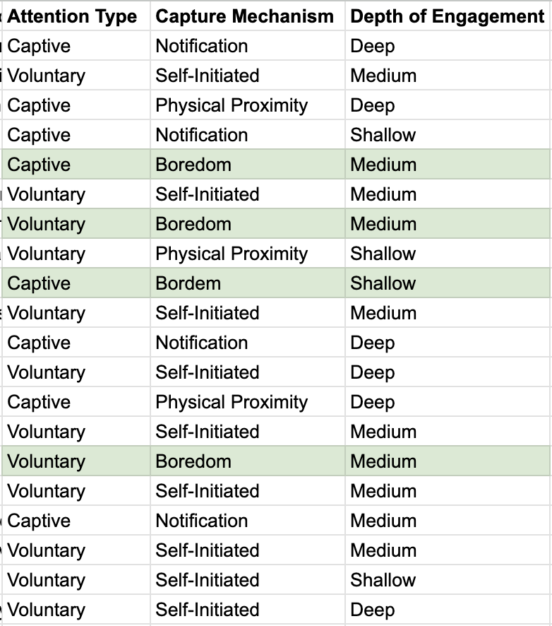 Second, I wanted to break down further how my attention was captured. I can assume that all of the voluntary attention was self-initiated. However, a pattern seemed to emerge when looking at my notes for external stimuli like where I was (physical proximity) or what caught my eye (notification) as well as my emotional state (specifically boredom). I chose to add another column that categorized each event by its “capture mechanism” and labelled the voluntary attention as a self-initiated mechanism. The capture mechanisms I settled on were, “notification”, “physical proximity”, and “boredom”.